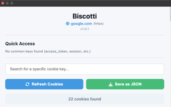 Biscotti är en användbar Chrome-tillägg som gör det enkelt för utvecklare att visa, söka och kopiera cookies från den aktiva webbplatsen. Den är designad för att underlätta arbete med autentisering och API:er, vilket gör den ovärderlig för utvecklare som behöver inspektera och manipulera cookie-data. Med ett enkelt och modernt gränssnitt kan användare snabbt navigera mellan cookies och få viktig information som domän, väg och utgångsdatum.